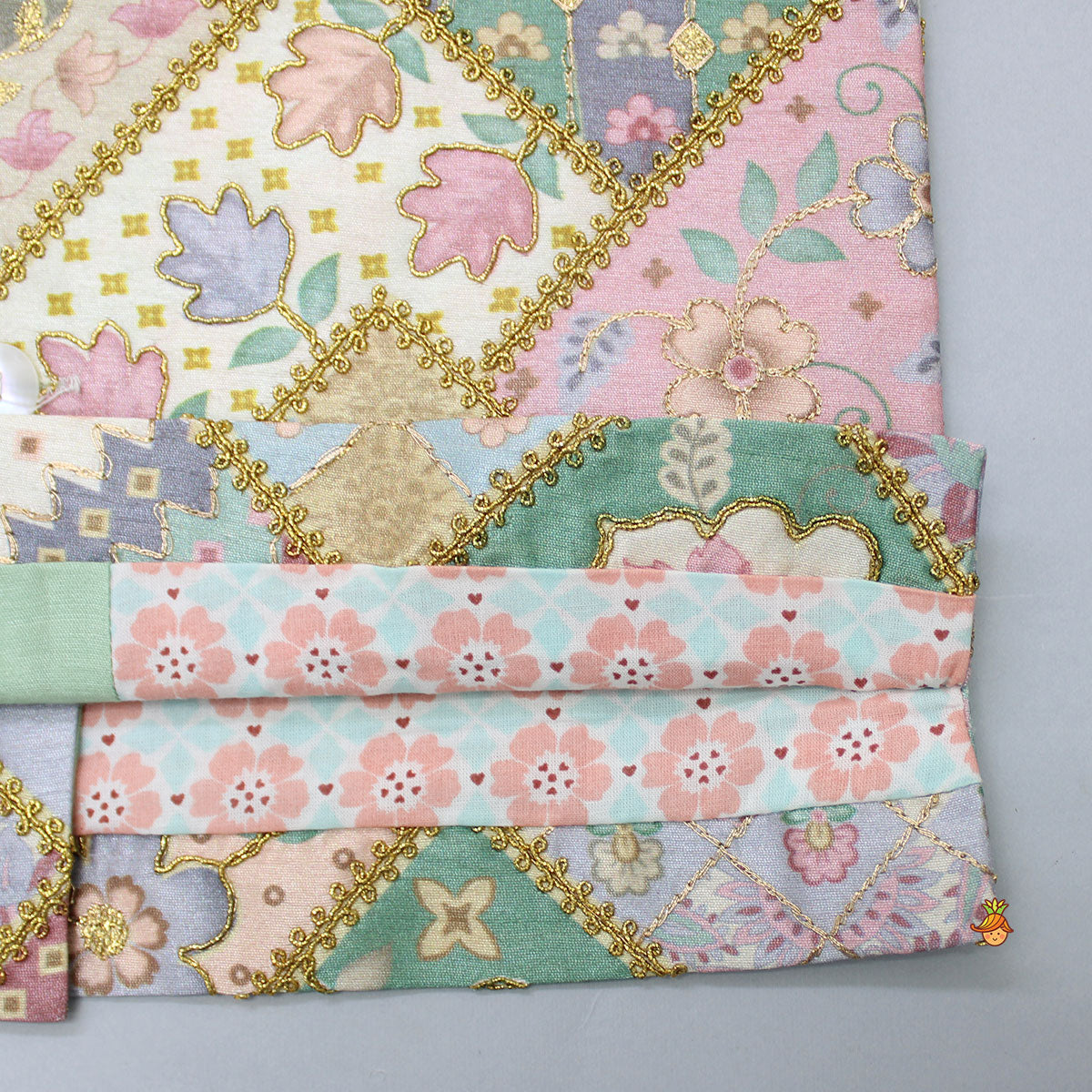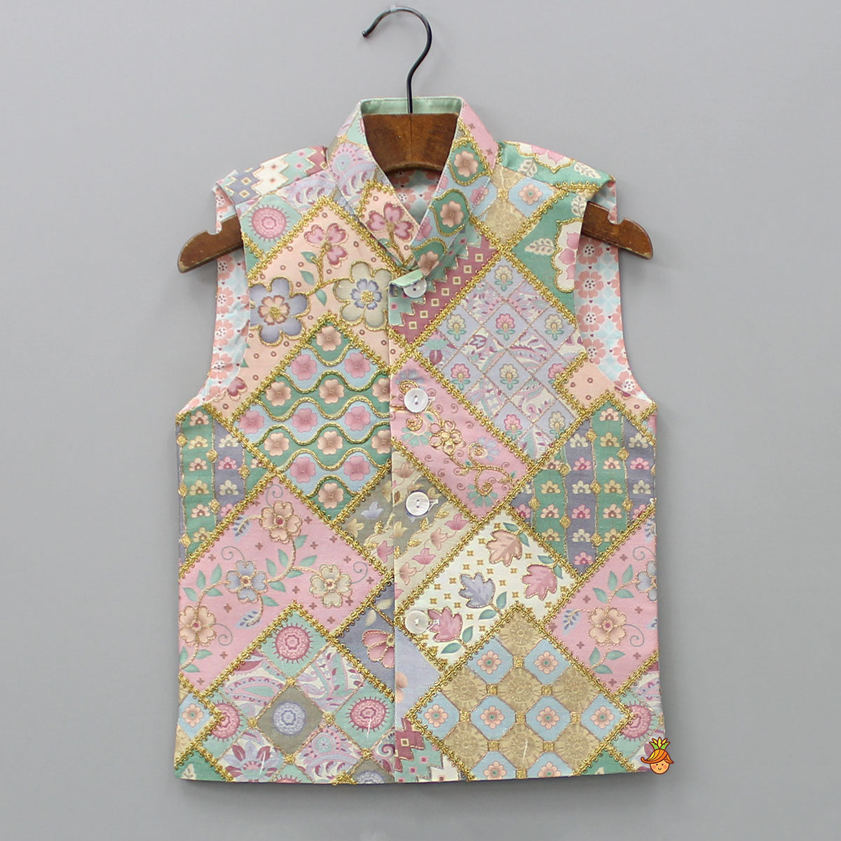 • Sleeveless printed Jacket with zari embroidery on it and pocket at front