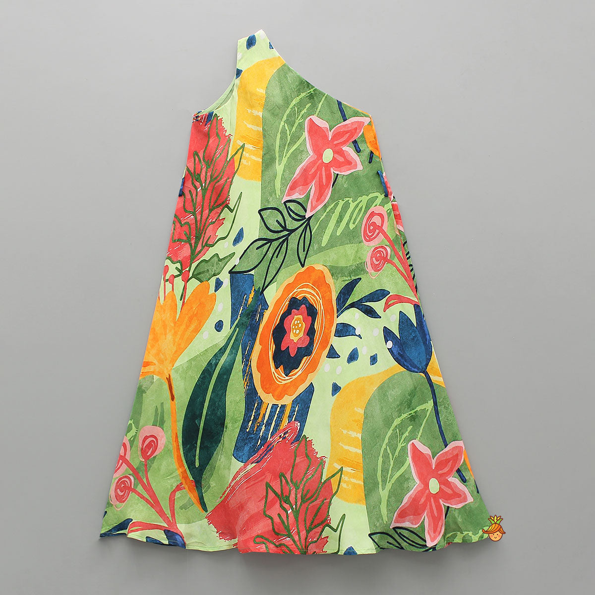 • One shoulder dress with multicolour floral prints all over it and side zip closure